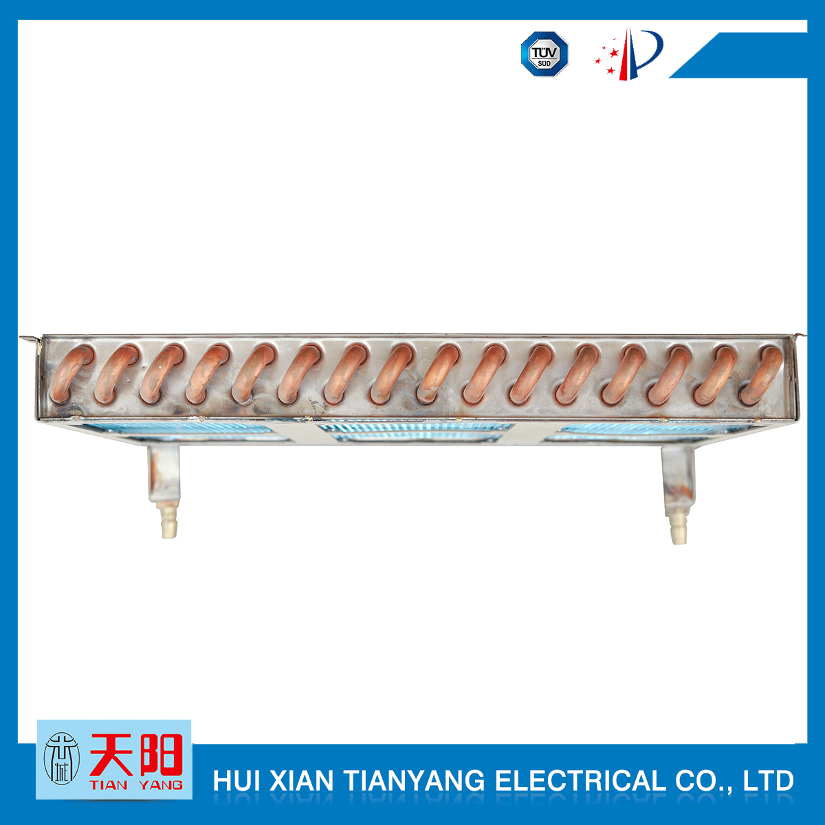 輝縣天陽電器有限責任公司位于肥沃的中原河南省輝縣市學院路中段工業集聚區興業園3號廠房,以制冷設備用冷凝器,蒸發器,熱交換器為主。主要材料為銅管鋁翅片,銅管銅翅片,鋁管鋁翅片。廣泛應用于冰箱冰柜,制冷設備,暖通設備,空調,自動售貨機,冷干機,超市立風柜,冷藏車,烘干機等產品領域?! 」咀?998年成立以來,始終堅持:“科技造就產業、質量成就信譽、誠信鑄就輝煌”的質量方針,從產品拓展上堅持“人無我有,人有我優,人優我特的”經營理念,25年來,從1998年開始供應河南冰熊集團下屬的冷柜廠,制冰機廠各種冷凝器;2003年之后,原冰熊集團的精英志士開始在全國各地發展,所到之處依托我公司供貨,以致于多家目前已具行業中佼佼者的公司,從而建立了如凱雪公司,兆邦公司、凌云公司、海寶公司、正雪公司、上海忠云、山東德萊維等幾十余家公司在草創時期的啟蒙供貨商,友好共贏長達十余年,成為我國制冷行業的供應商。以致在2015年初雙匯集團面向社會的招標書中指名要我公司冷凝器、蒸發器指定產品供應商